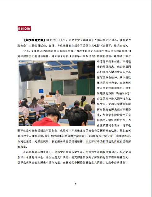 会上,支部书记赵海燕带领支部成员学习了习近平总书记在庆祝中华人民共和国成立74周年招待会上的讲话精神,并分享了电影《志愿军:雄兵出击》的观影感悟。她感动于影片中志愿军勇于付出、不畏艰难的顽强意志,倡议党员同志们要深入学习中国人民志愿军的革命精神,从中汲取强大的精神力量,充分发挥党员的先锋模范作用,以更加饱满的热情、昂扬的斗志、奋发的精神投入到学习和工作中去,更加自觉地为实现新时代党的历史使命不懈奋斗。与会党员纷纷分享了心得体会。2023级应用统计专业王若晨同学表示,这部电影不仅是对抗美援朝战争的纪念,也是对中华英雄儿女的致敬和爱国精神的弘扬,他们的英勇精神令人肃然起敬,我们要时刻牢记党员的使命和责任;2023级统计学专业王越同学表示,山河已无恙,光影致英雄。我们要传承抗美援朝精神,以实际行动为祖国建设贡献自己微薄的力量。