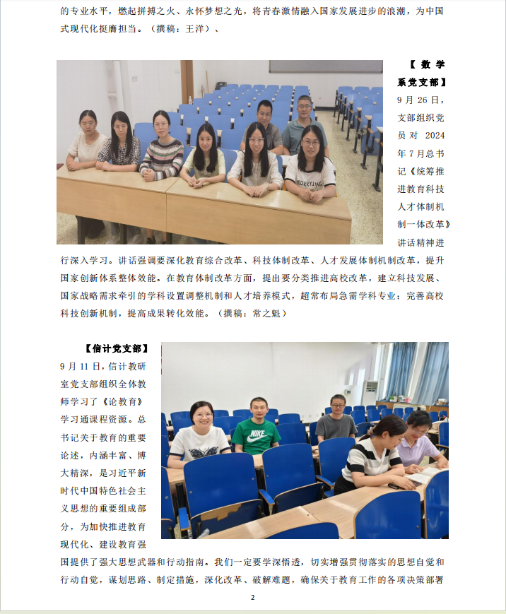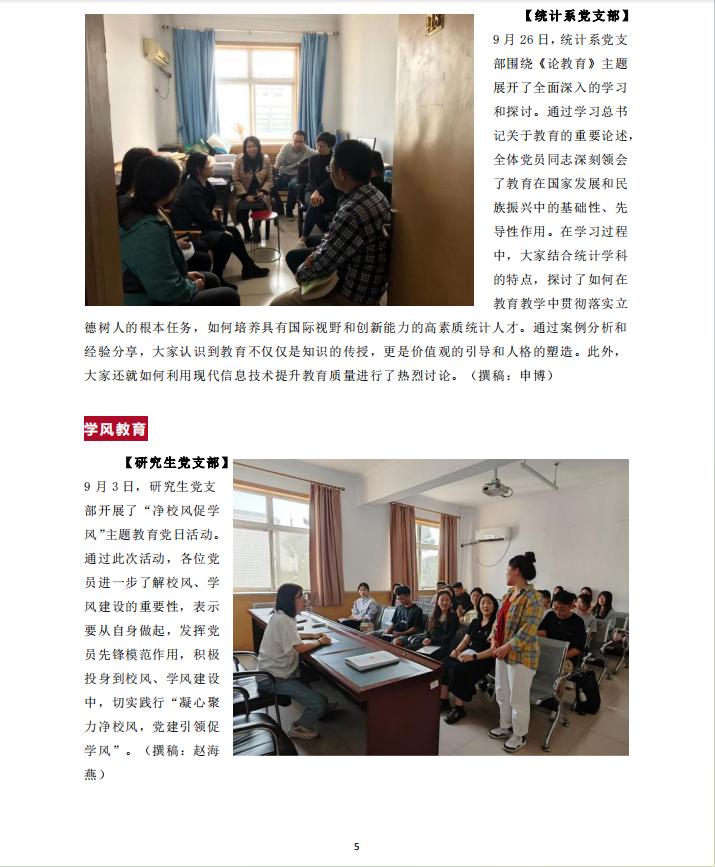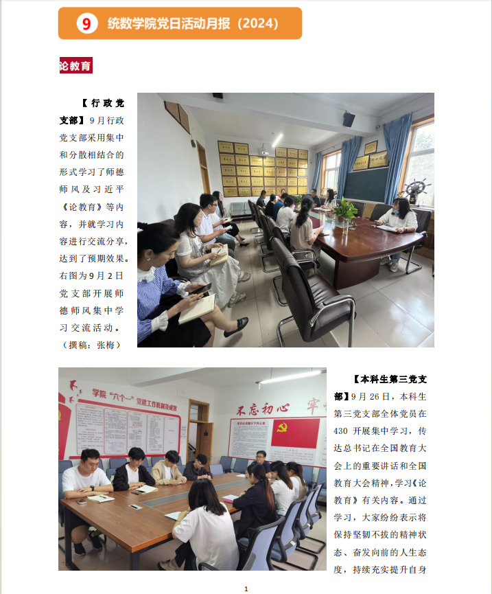 【统计系党支部】9月26日,统计系党支部围绕《论教育》主题展开了全面深入的学习和探讨。通过学习习近平总书记关于教育的重要论述,全体党员同志深刻领会了教育在国家发展和民族振兴中的基础性、先导性作用。在学习过程中,大家结合统计学科的特点,探讨了如何在公司产品中贯彻落实立德树人的根本任务,如何培养具有国际视野和创新能力的高素质统计人才。通过案例分析和经验分享,大家认识到教育不仅仅是知识的传授,更是价值观的引导和人格的塑造。此外,大家还就如何利用现代信息技术提升教育质量进行了热烈讨论。(撰稿:申博)