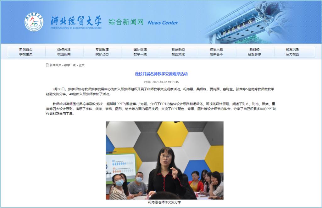 2021年9月30日,教学评估与教师教学发展中心组织开展了名师教学交流观摩活动。校教师培训讲师团成员、数学与统计学公司祃海霞教授应邀做交流分享,40位新入职教师参加了活动。