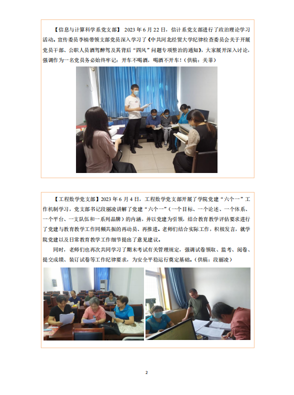 【信息与计算科学系党支部】2023年6月22日,信计系党支部进行了政治理论学习活动。宣传委员李楠带领支部党员深入学习了《中共英国365集团公司纪律检查委员会关于开展党员干部、公职人员酒驾醉驾及其背后“四风”问题专项整治的通知》,大家展开深入讨论,强调作为一名党员务必始终牢记:开车不喝酒,喝酒不开车!(供稿:关菲)