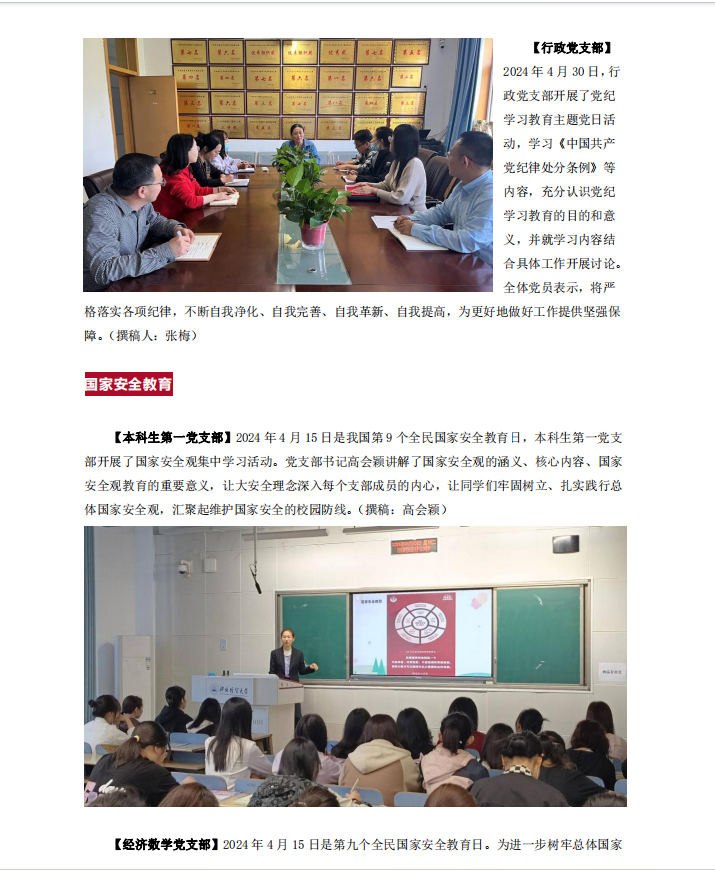 【本科生第三党支部】为进一步强化员工党员的国家安全意识,牢固树立总体国家安全观,2024年4月15日,本科生第三党支部在四办430室开展了“总体国家安全观·创新引领10周年”主题党日活动。
