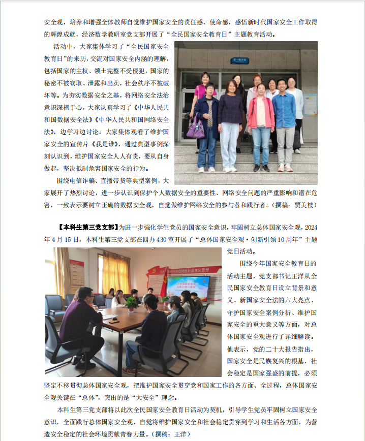 【经济数学党支部】2024年4月15日是第九个全民国家安全教育日。为进一步树牢总体国家安全观,培养和增强全体教师自觉维护国家安全的责任感、使命感,感悟新时代国家安全工作取得的辉煌成就,经济数学教研室党支部开展了“全民国家安全教育日”主题教育活动。