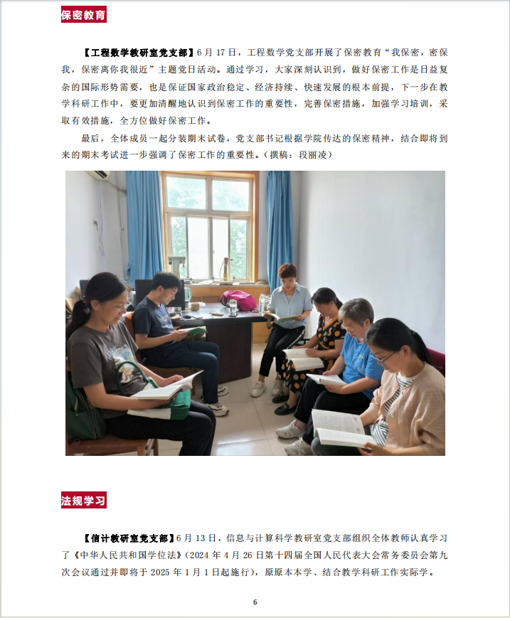 【信计教研室党支部】6月13日,信息与计算科学教研室党支部组织全体教师认真学习了《中华人民共和国学位法》(2024年4月26日第十四届全国人民代表大会常务委员会第九次会议通过并即将于2025年1月1日起施行),原原本本学、结合教学科研工作实际学。