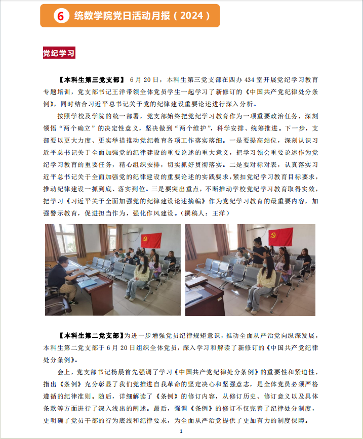 【本科生第三党支部】6月20日,本科生第三党支部在四办434室开展党纪学习教育专题培训,党支部书记王洋带领全体党员员工一起学习了新修订的《中国共产党纪律处分条例》,同时结合习近平总书记关于党的纪律建设重要论述进行深入分析。