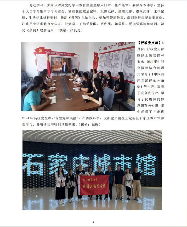 【行政党支部】6月份,行政党支部按照上级安排和要求,采用集中和分散相结合的形式学习了《中国共产党纪律处分条例》等内容,观看了安全宣传片,学习了民族共同体意识有关知识,集中观看了“走进2024年高公司党组织示范微党课展播”。在实践环节,支部党员前往正定新区石家庄城市馆参观学习。各项活动均收到预期效果。(撰稿:张梅)
