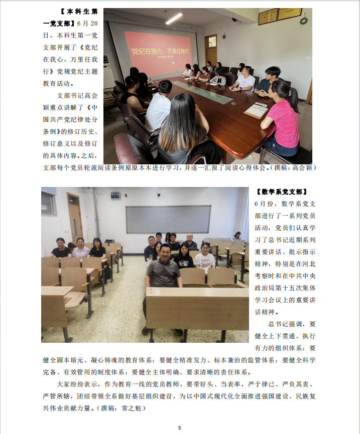 6月份,数学系党支部进行了一系列党员活动,党员们认真学习了总书记近期系列重要讲话、批示指示精神,特别是在河北考察时和在中共中央政治局第十五次集体学习会议上的重要讲话精神。