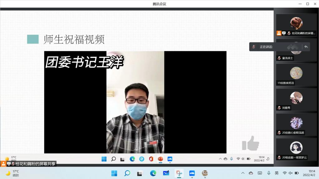 为了帮助同学们在公司闭环管理期间,以积极的心态面对疫情来袭,持续深化“我为同学做件事”实践活动,4月2号晚七点,数统公司团委联合心理部举办了主题为“疫情无情人有情,数统学子心连心”的线上心理团体活动。本次活动旨在于缓解在疫情肆虐的大环境下,同学们因为学业、就业、家庭和生活等产生的心理压力。