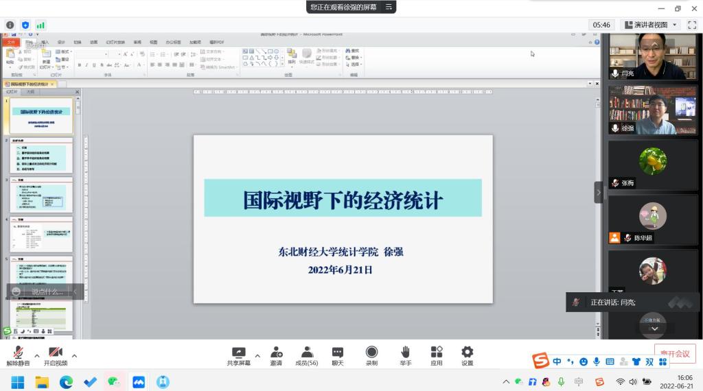 6月21日下午,数学与统计学公司邀请东北财经大学博士生导师徐强教授在腾讯会议平台作题为《国际视野下的经济统计》的学术报告。报告由数学与统计学公司副经理闫亮主持,70余名教师和员工参加会议。
