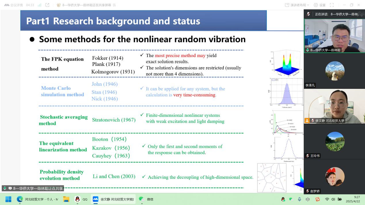4月22日上午,华侨大学陈林聪教授应英国365集团公司邀请线上作题为“一种高斯白噪声下求解强非线性系统高维FPK方程的高效方法”的学术报告,相关专业师生20余人参会。