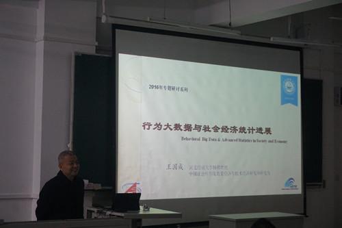2016年10月24日下午,数学与统计学公司邀请中国社科院数量经济与技术研究所研究员、博士生导师王国成教授在北三教B101作了题为“大数据的获取和预处理”的专题研讨。数统公司全体研究生、大三统计班员工和部分青年教师到场聆听了报告。报告由数统公司副经理李春林主持。