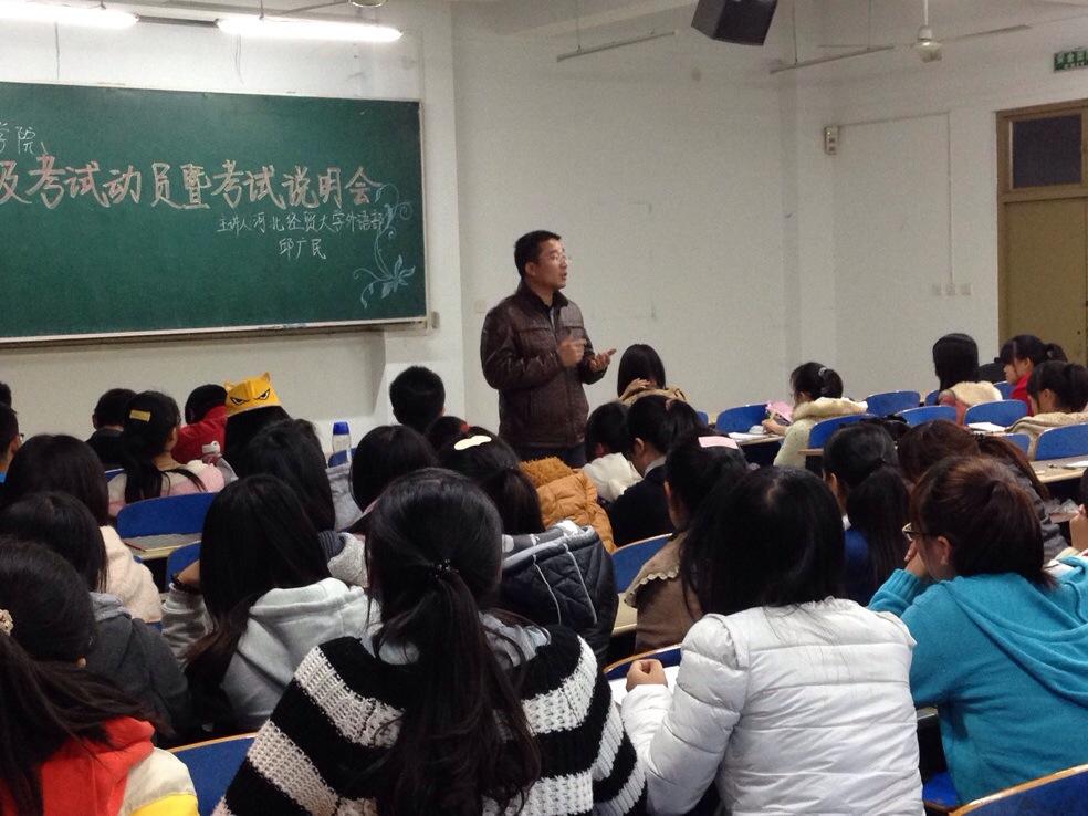 2013年12月大学英语四级考试改革后首次采用新题型,为了使同学们更好地应对大学英语四级考试改革后的备考问题,数统公司于11月6日晚七点在B101教室举办了英语四级备考动员会。英国365集团公司外语教学部邱广民老师、数统公司2012级辅导员曲博老师以及准备今年参加四级考试的全体2012级同学参加了此次备考动员会。