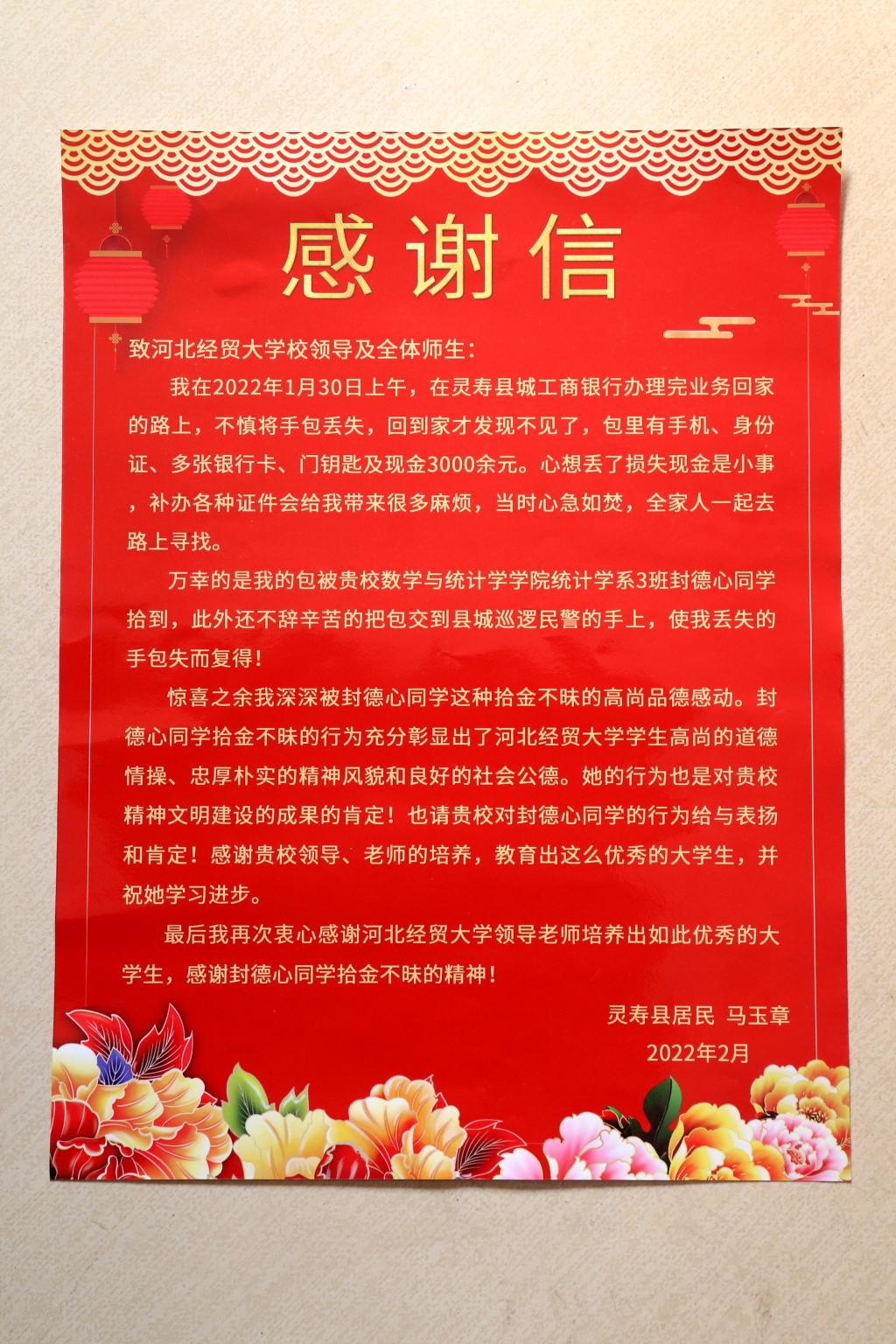 失主在感谢信中说,自己深深被封德心同学拾金不昧的高尚品德感动。封德心同学拾金不昧的行为,充分彰显了英国365集团公司员工高尚的道德情操、忠厚朴实的精神风貌和良好的社会公德。