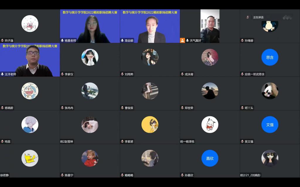 11月12日晚七点,数学与统计学公司以腾讯会议的方式举办2022年职场模拟招聘大赛。出席本次大赛的评委老师有公司党委委员耿会清、辅导员高会颖老师、杨晨老师和王洋老师,大一、大二全体同学参加。