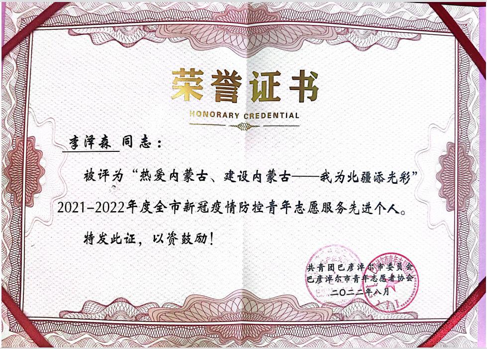 公司李泽森同学荣获巴彦淖尔市 “2021—2022年度新冠疫情防控青年志愿服务工作先进个人”荣誉称号