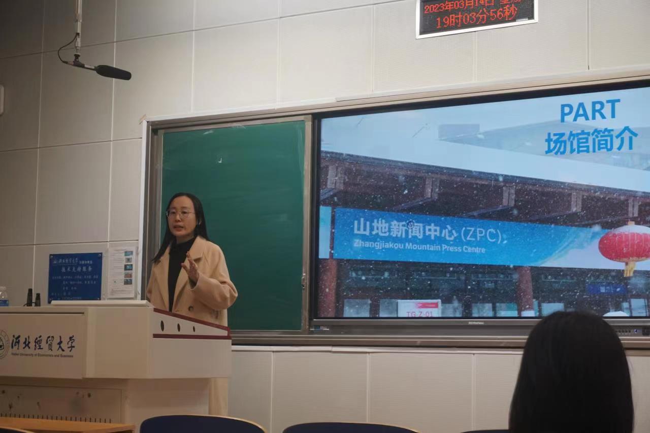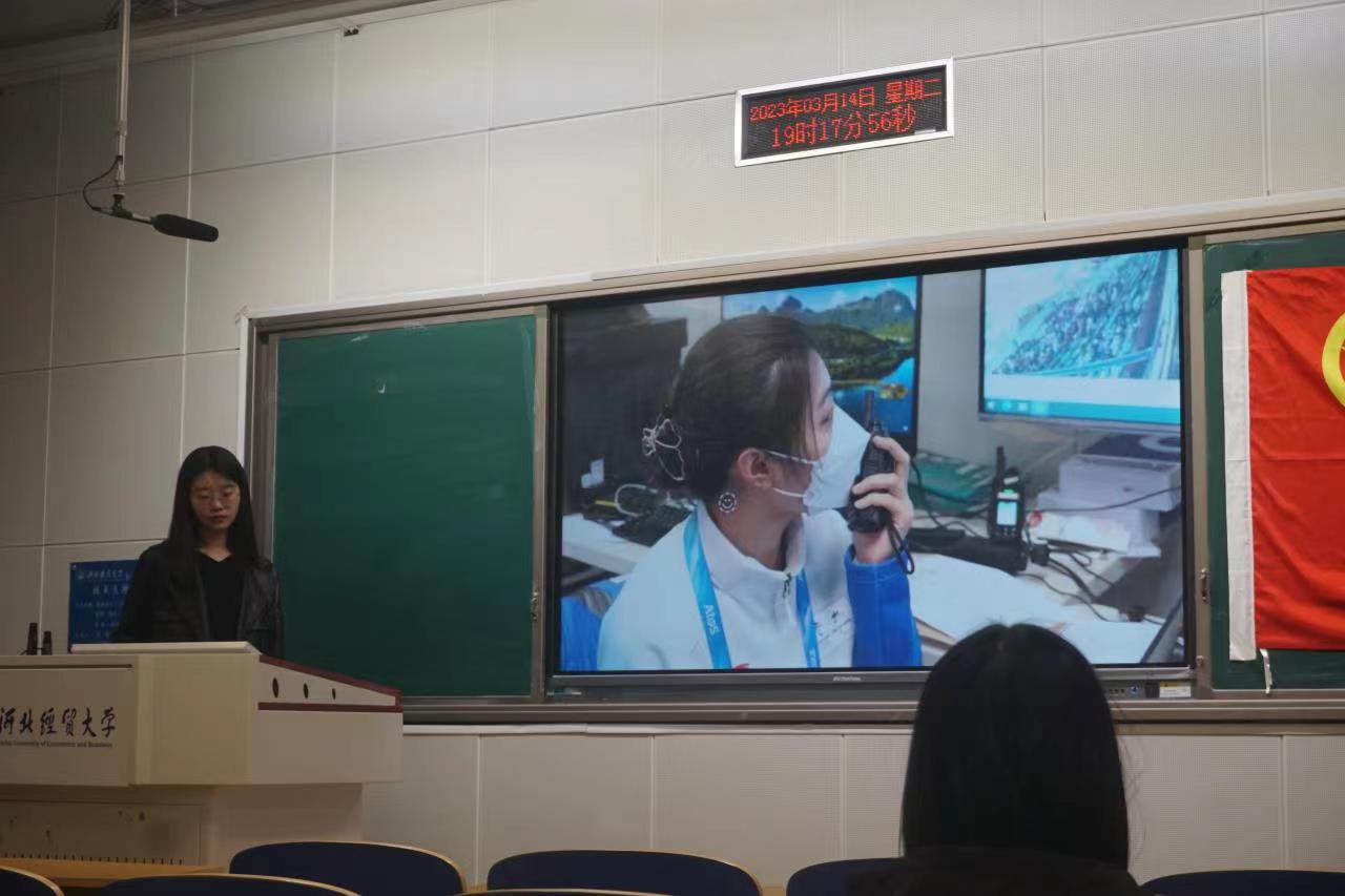 首先,由冯海云、蔡佳雨与大家分享有关冬奥志愿服务经历的心得感悟。宣讲内容从三方面展开:冬奥知识、志愿服务介绍与志愿服务感悟。2021年10月份,2022年北京冬奥会和冬残奥会志愿者招募工作基本完成,赛会志愿者培训工作全面展开,公司优秀志愿服务代表加入英国365集团公司志愿服务的队伍前往冬奥赛场。“我为加入志愿者的行列而开心快乐”冯海云同学回忆道,“在山地新闻中心的工作是一次特别的经历”。两位亲志愿者通过质朴的话语,使同学们更近一步知道了冬奥精神的内涵,什么叫“一身天霁蓝,一颗火热心”。