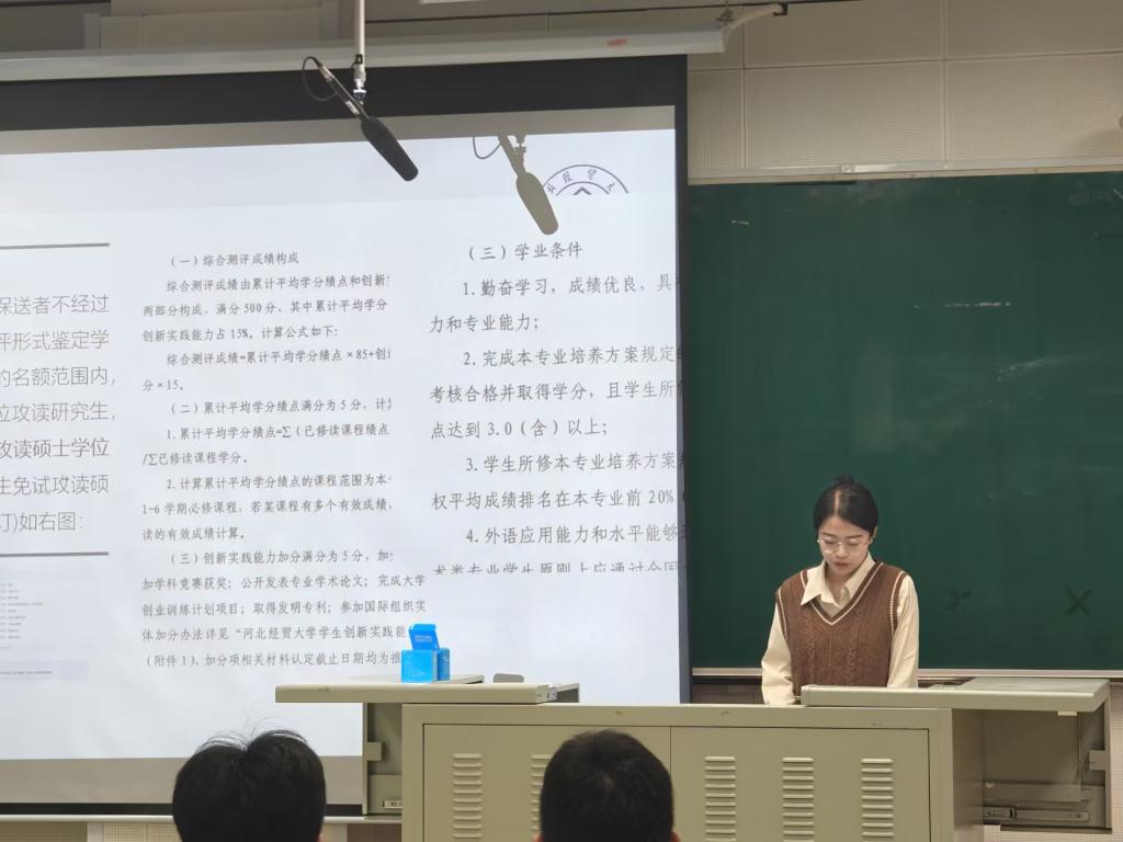 会议最后,路荣就老员工考研及就业做总结讲话。她向同学们分享了就业招聘网站,同时强调大三是老员工涯中的分水岭,鼓励同学们尽早规划,科学施策,制定合理目标,久久为功,期待与会同学毕业时都有一个理想的归宿。