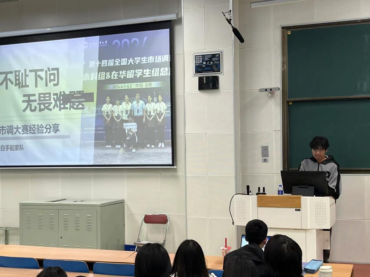 随后,本科生组获奖成员孙天伦同学从自身参赛经验出发,从组队环节、选题环节、问卷设计、数据分析、PPT制作等5个环节向同学们进行了重点讲解。其中孙天伦同学强调了在问卷设计过程中,同学们需要考虑模型应用、问题设置的完备性、问卷整体的可读性等方面,为同学们带来了宝贵的经验分享。
