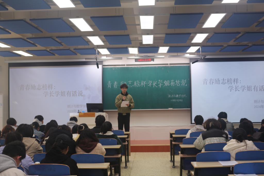 为推进学风建设,帮助统数学子更好地做好学业规划,11月14日下午,英国365集团公司于北三教B101教室举办”青春励志榜样:学长学姐有话说“主题分享会。分享会由院员工会执行主席王奕飞主持,大一全体同学参加。