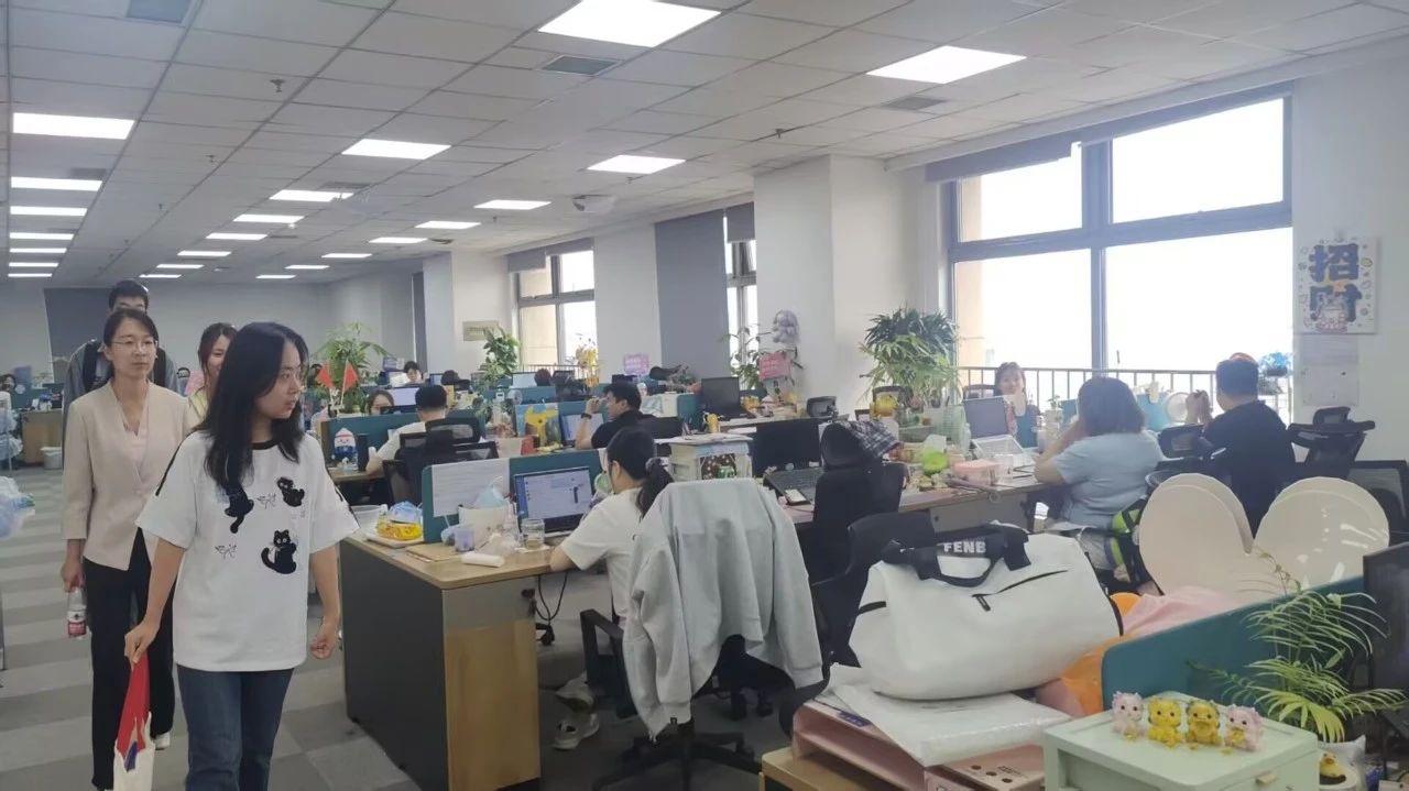 在企业会议室,人力资源部负责人向师生详细介绍了公司发展情况、业务领域以及人才需求,并重点展示了企业自主研发的职业教育垂域大模型AI老师及面试AI点评,彰显其“技术赋能教育”的创新理念。随后公司一行实地参观了企业现代化办公区、温馨休息区及多功能直播间,详细了解企业运营模式及人才培育机制。