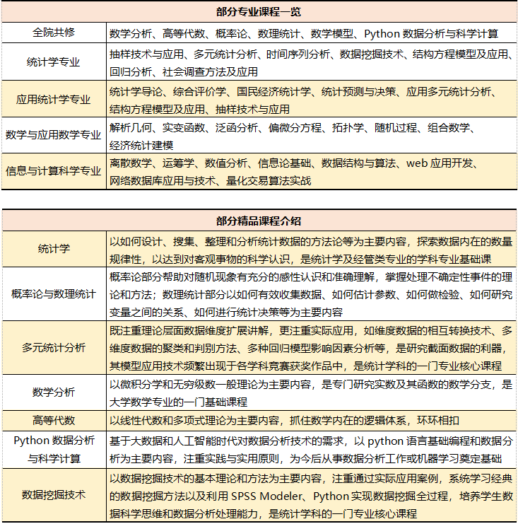 培养目标:培养具有较高的数学与经济学素养,掌握现代统计学理论和方法,能够熟练运用计算机和统计软件方法,能在企事业、经济、金融、保险等部门从事数据采集、预处理、数据挖掘、大数据应用分析及开发、数据可视化等工作的高素质复合型应用人才。