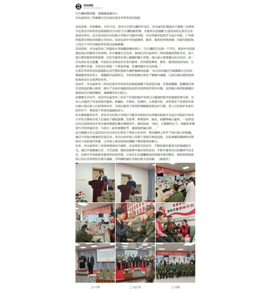 九九重阳敬英雄,温情满溢暖兵心 河北省军休二所健康义诊走进石家庄市荣军优抚医院
